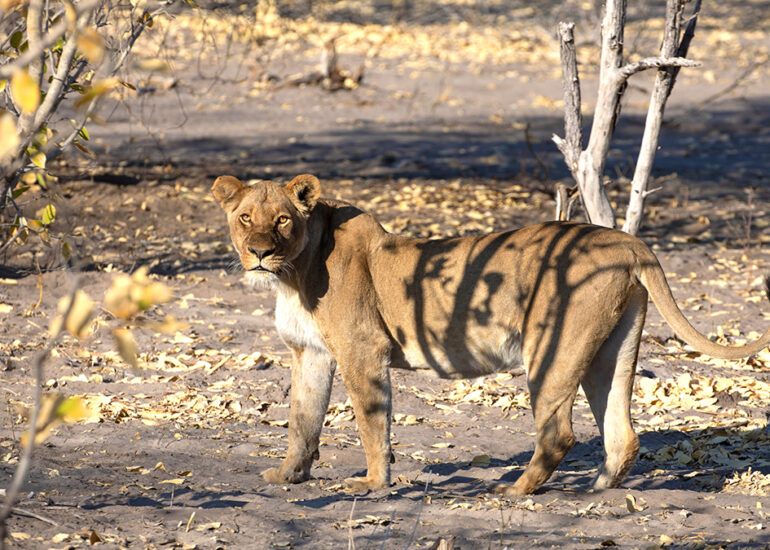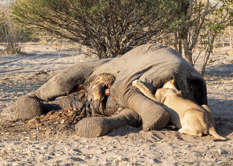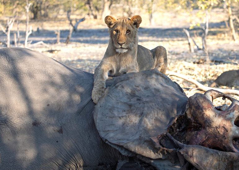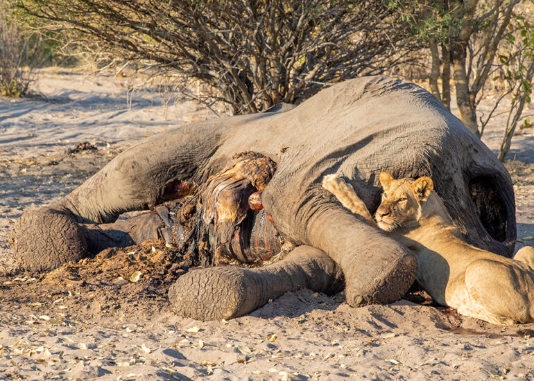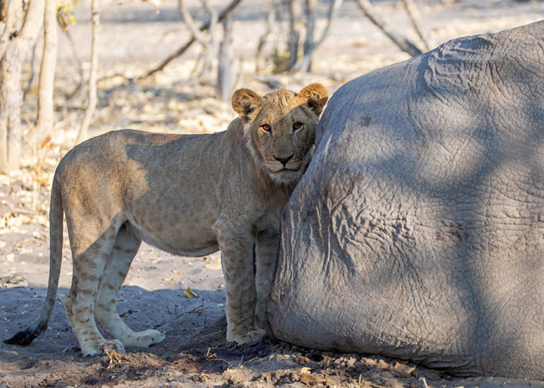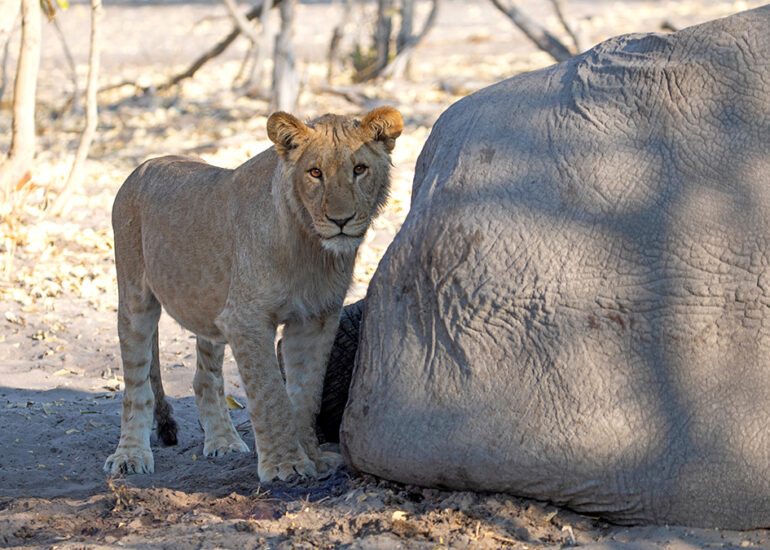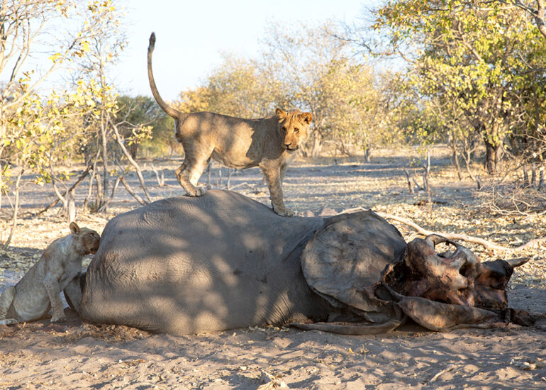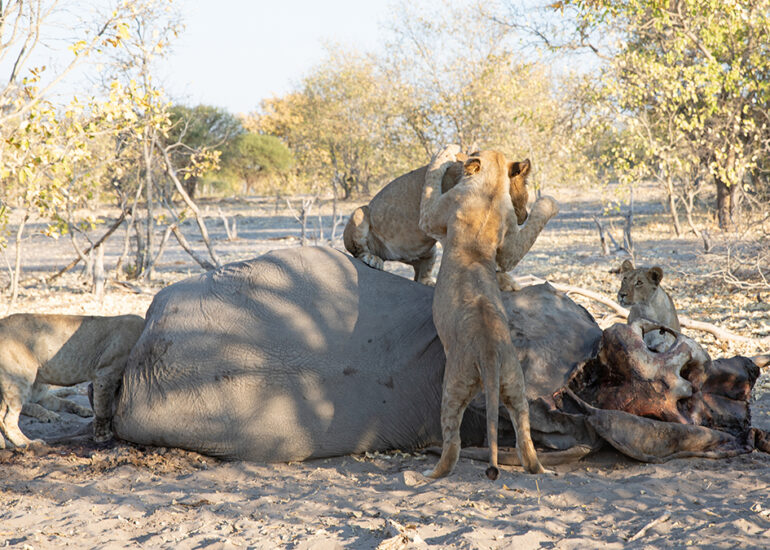 Savutis Löwen jagen Elefanten. Wann und warum ausgerechnet Savutis Löwenrudel damit angefangen haben, wird von Wissenschaftlern heiß diskutiert. Da das Verhalten vermehrt in der Trockenzeit beobachtet wird und in keinem anderen Gebiet Afrikas oder zumindest nicht regelmäßig auftritt, nimmt man an, dass das Nahrungsangebot für Löwen im staubigen Savuti ab August dramatisch knapp wird. Alle Weideflächen sind dann abgegrast, so dass Grasfresser an den Chobe oder ins Okavangodelta abwandern. Jetzt in der Trockenzeit begegnet uns hier kein einziges Zebra und kein einziger Büffel mehr. Nur Impalas, eine Hand voll widerstandsfähiger Gnus und jede Menge Elefanten, (allesamt grazer und browser) finden zu dieser Jahreszeit noch Nahrung in dieser Einöde. Hinzu kommt, dass Savutis Löwenrudel mit häufig über 20 Individuen ungewöhnlich groß sind, was bei der Jagd einerseits ein Vorteil ist, andererseits aber auch bedeutet, dass ein vergleichsweise kleines Impala allenfalls als Appetizer für die Rudel in Frage kommt.