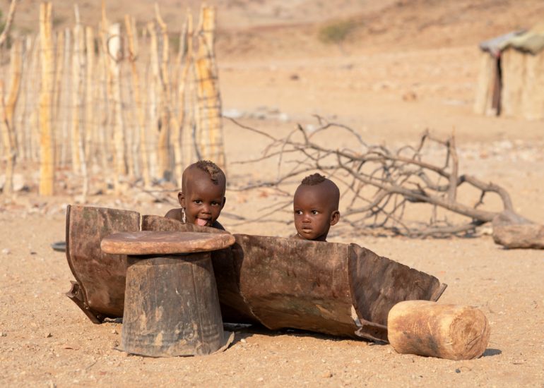 Himbamädchen tragen zwei Zöpfe nach vorne - Kaokoland