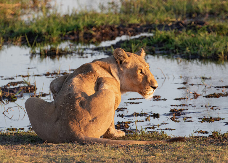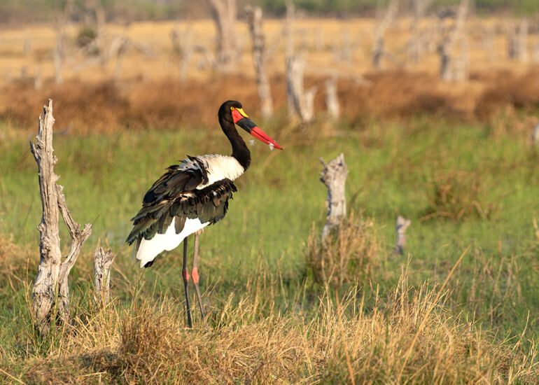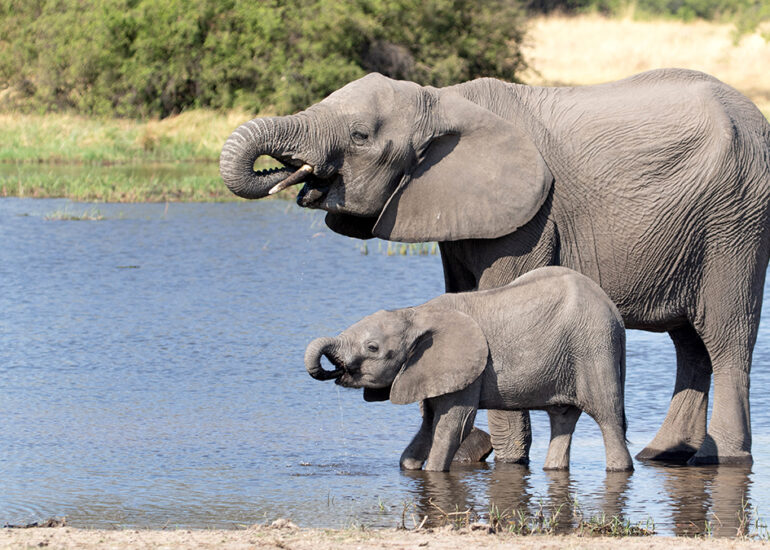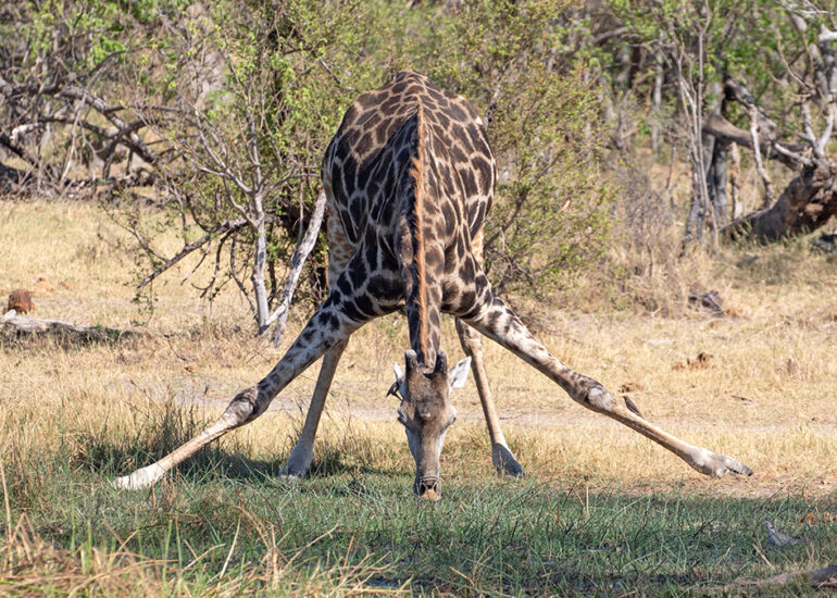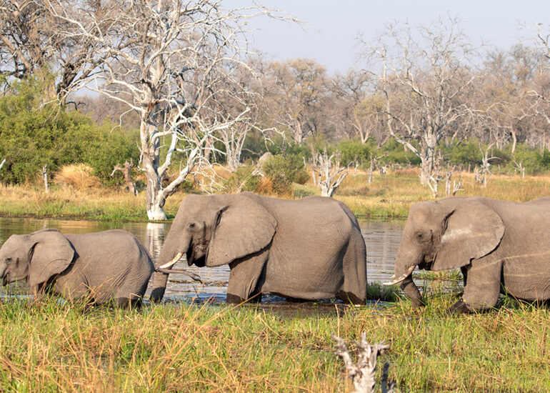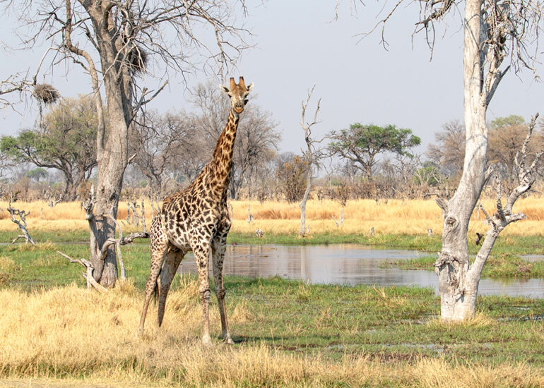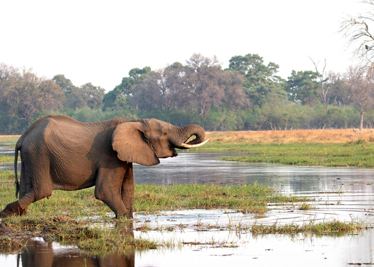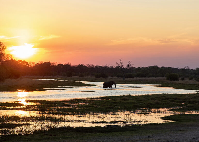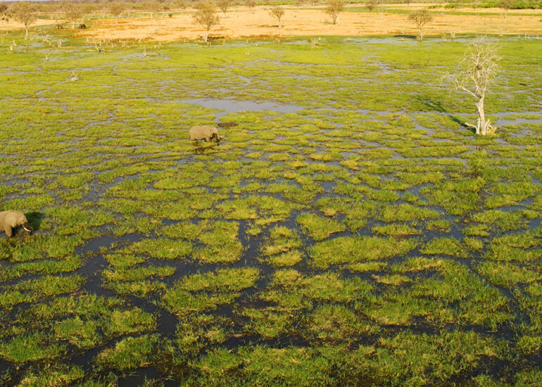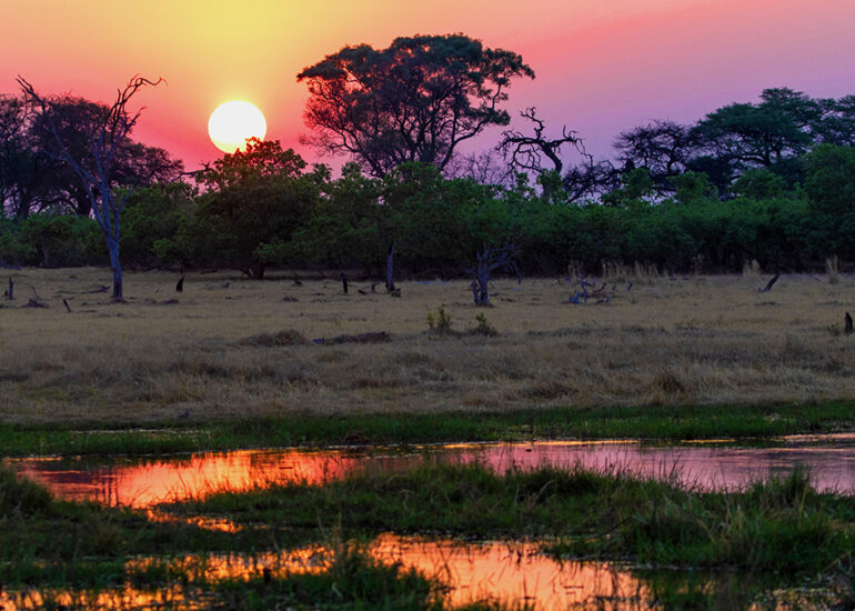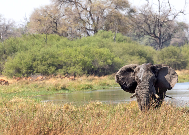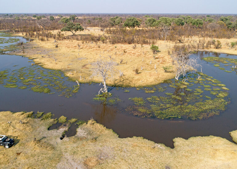 Der Oktober in Botswana ist mit Tagestemperaturen jenseits der 40 Grad, einem erbarmungslos vom Himmel brennenden Lorenz und tonnenweise Staub nicht der Lieblingsmonat der Tswana. Zu dieser Jahreszeit ist die 150 km lange Piste von Maun in Richtung Okavangodelta eine brettharte Wellblechpiste. Dabei fährt man durch lebensfeindlich wirkende Mopanewälder, an denen kein einziges Blatt mehr hängt. Wenn sich hinter Mababe der Blick auf die ersten Überschwemmungsebenen und Lagunen des Mababe River öfffnet, einem der östlichsten Flüsse des Okavangodeltas, könnte der Kontrast nicht größer sein: plötzlich steht man vor einem grünen Meer aus Gras, Schilf und Wasserrosen, das badende Elefanten, durstige Giraffen und eine ohrenbetäubende Armada von Wasservögeln anlockt. Wir parken den panierten Landy am Fluss, beobachten die ersten Elis und Giraffen beim Trinken und kommen uns vor, als wären wir auf einem eigenen Planeten angekommen...
