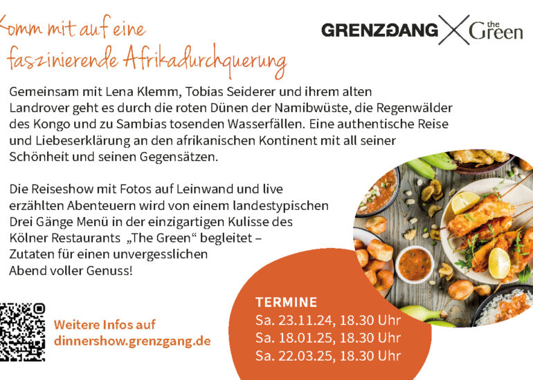 Endlich gibt es nach der Pandemie wieder Reisedinnershows und wir sind diesen Winter gleich mehrfach mit Grenzgang im Kölner Restaurant the Green zu Gast. Wer also zwischen November und März das Fernweh nicht mehr aushält, dem empfehlen wir eine wunderbare Afrikareise in Verbindung mit einer großartigen kulinarischen Reise in Form eines afrikanischen Dreigängemenus. Nähere Informationen zum Ablauf der Veranstaltungen und vor allem zum Menu erhaltet Ihr über diesen Link. Da die beiden ersten Veranstaltungen schon ausverkauft sind, gibt es im Januar und März jeweils noch einen Zusatztermin.