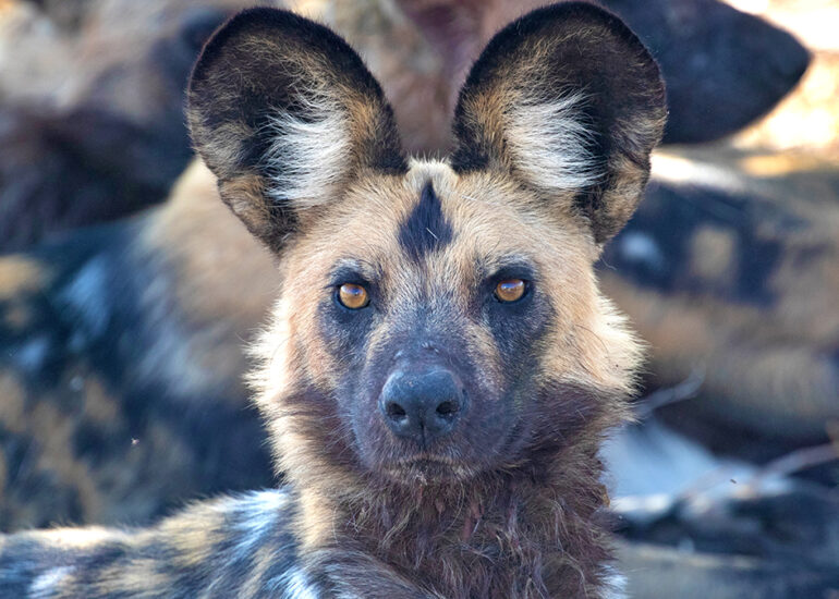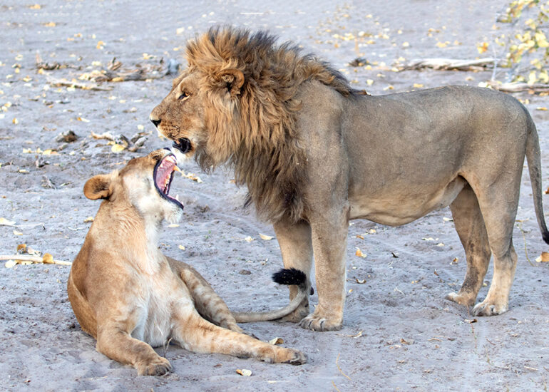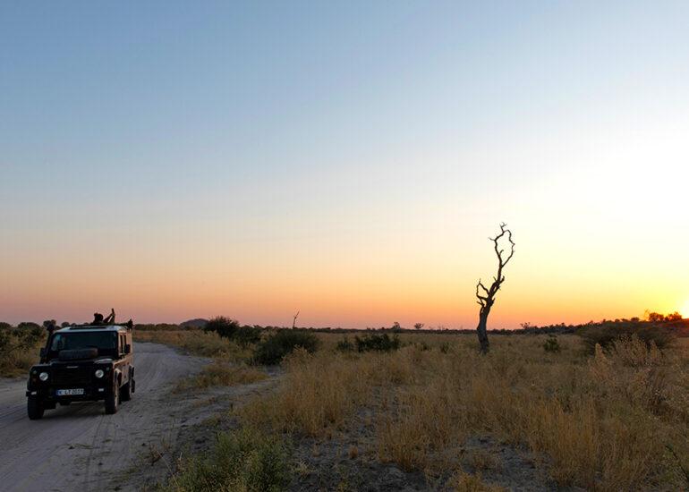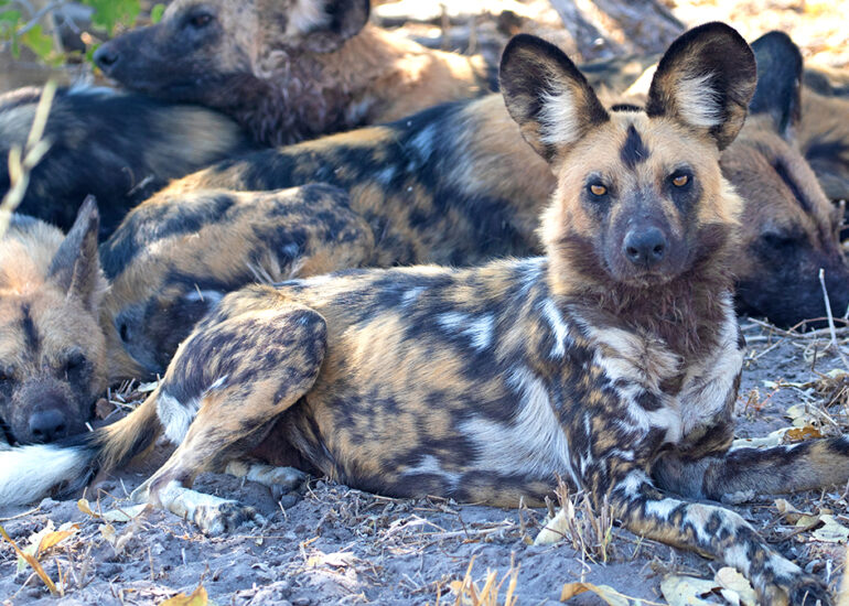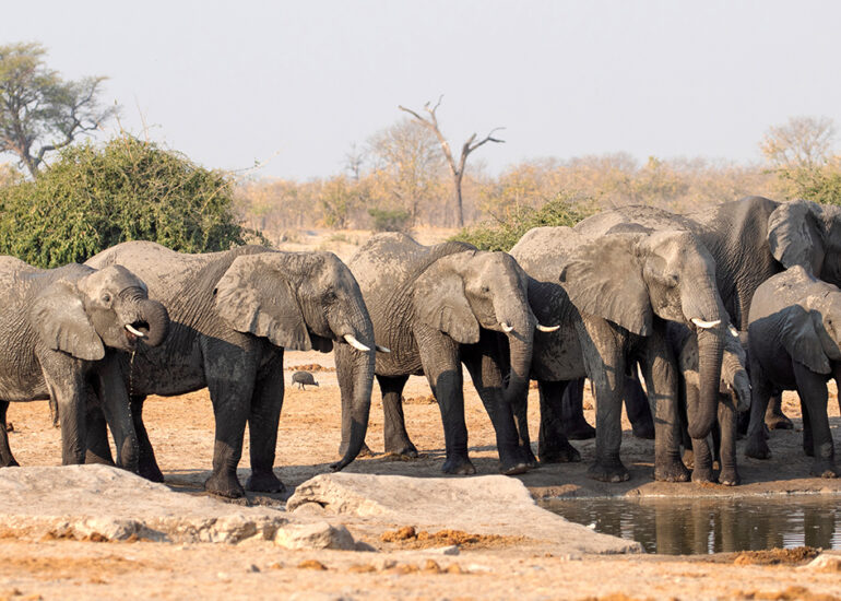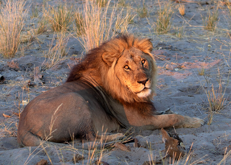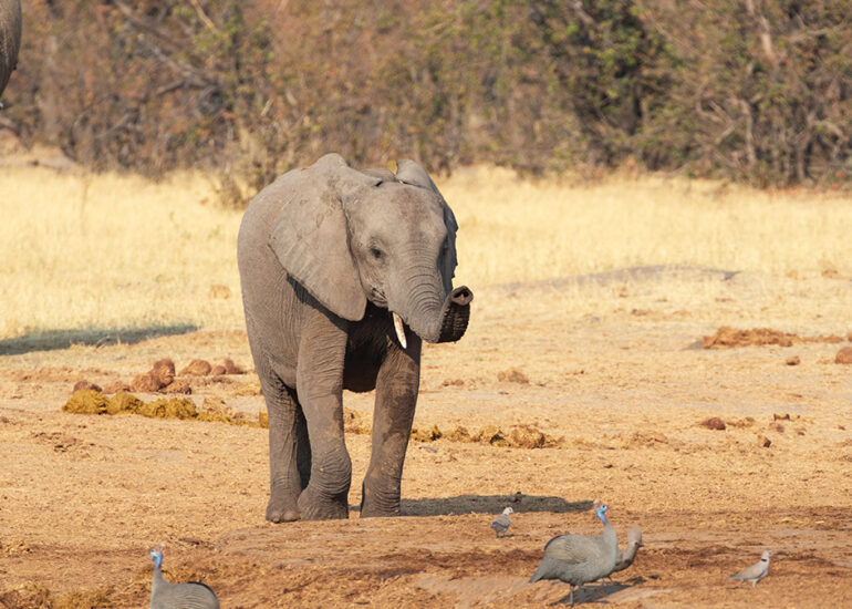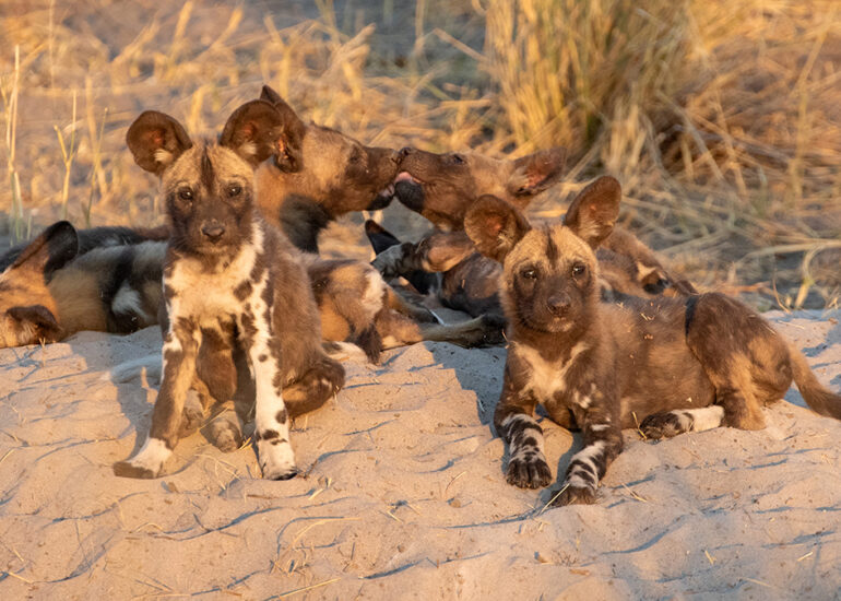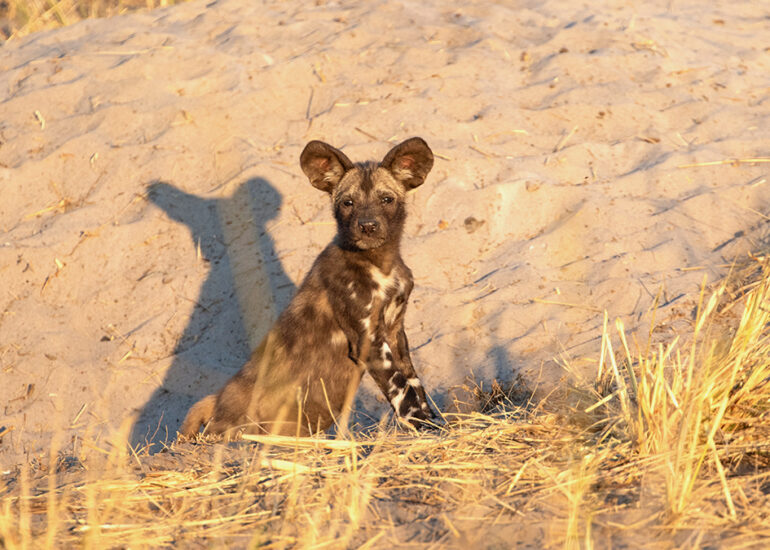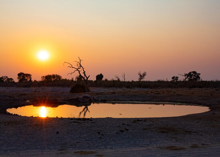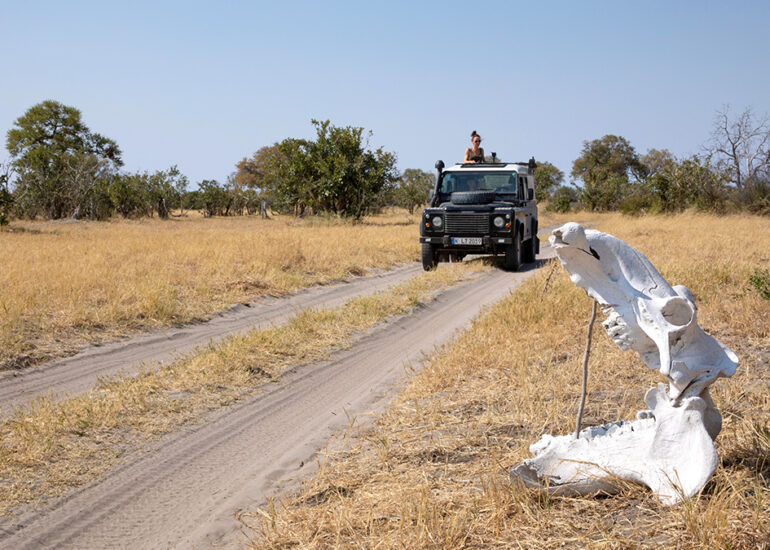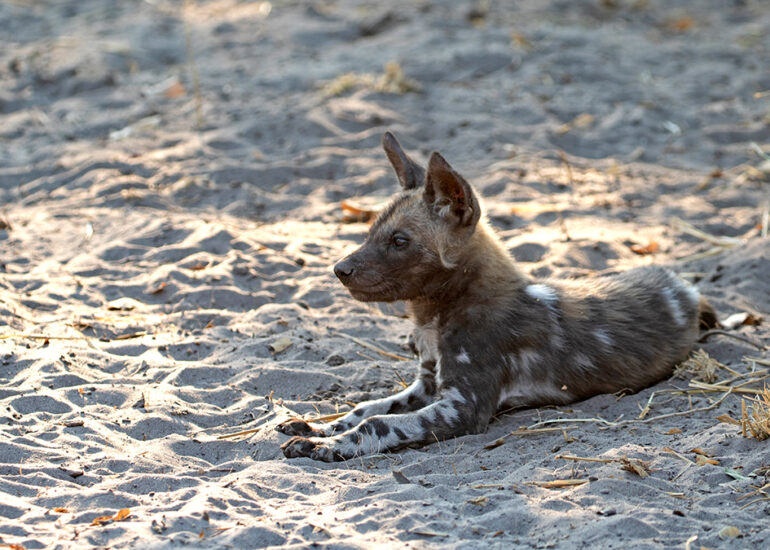 Seit 2016 ist der Savuti wieder komplett versiegt und jetzt in der Trockenzeit Anfang August zeugen nur noch Hippo- oder Krokodilskelette davon, dass diese dustbowl noch vor ein paar Jahren eine überschwemmte Sumpflandschaft war. Der Fluss ist verschwunden, die Tiere aber geblieben. Drei letzte Wasserlöcher sichern das Überleben der Tierwelt in dieser legendären Safariregion im Herzen des Chobe Nationalparks. Savuti ist bekannt für seine hohe Dichte an Elefanten und Raubtieren. Gleich in der Nähe unserer Campsite ziehen Wildhunde ihre Jungen im Bau auf. Das ansässige Löwenrudel macht nachts ohrenbetäubenden Lärm und schon am ersten Morgen finden wir frische Elefantenspuren neben unserem Zelt :-).